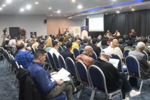 افتتحت أعمال اليوم الثاني بجلسة أدارتها السيدة أسماء خرخر، عضوة المكتب التنفيذي للمرصد، تمحورت حول موضوع “إدارة الأزمات والكوارث في المجال الحضري”. تضمنت الجلسة عروضاً علمية قدمها خبراء محليون ووطنيون متخصصون في التنمية المستدامة وإدارة المخاطر. تناول الأستاذ حسن أغزول استراتيجيات التكيف مع التغيرات المناخية ودورها في تقليل تأثير الكوارث على المدن. كما ركز الأستاذ محمد نبّو على دور المدن الإفريقية في تعزيز الصمود الحضري، مشيراً إلى أهمية بناء شبكات تعاون إقليمية. أما الأستاذة نجوى معروف، فقد أوضحت أهمية التخطيط الترابي الدقيق لتقليل هشاشة النظم الحضرية أمام الكوارث. وسلط الأستاذ عبد الرحيم كسيري الضوء على الشراكات الوطنية والمحلية كآلية أساسية لتعزيز صمود المدن، وقدم نظرة شاملة حول الوضعية الراهنة وطنياً فيما يخص الإجراءات الاستباقية في ظل الكوارث الطبيعية الناتجة عن التغيرات المناخية.